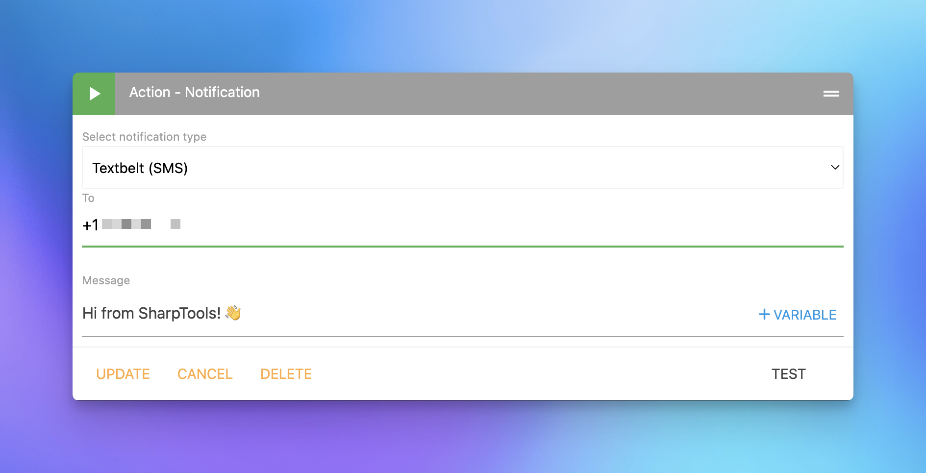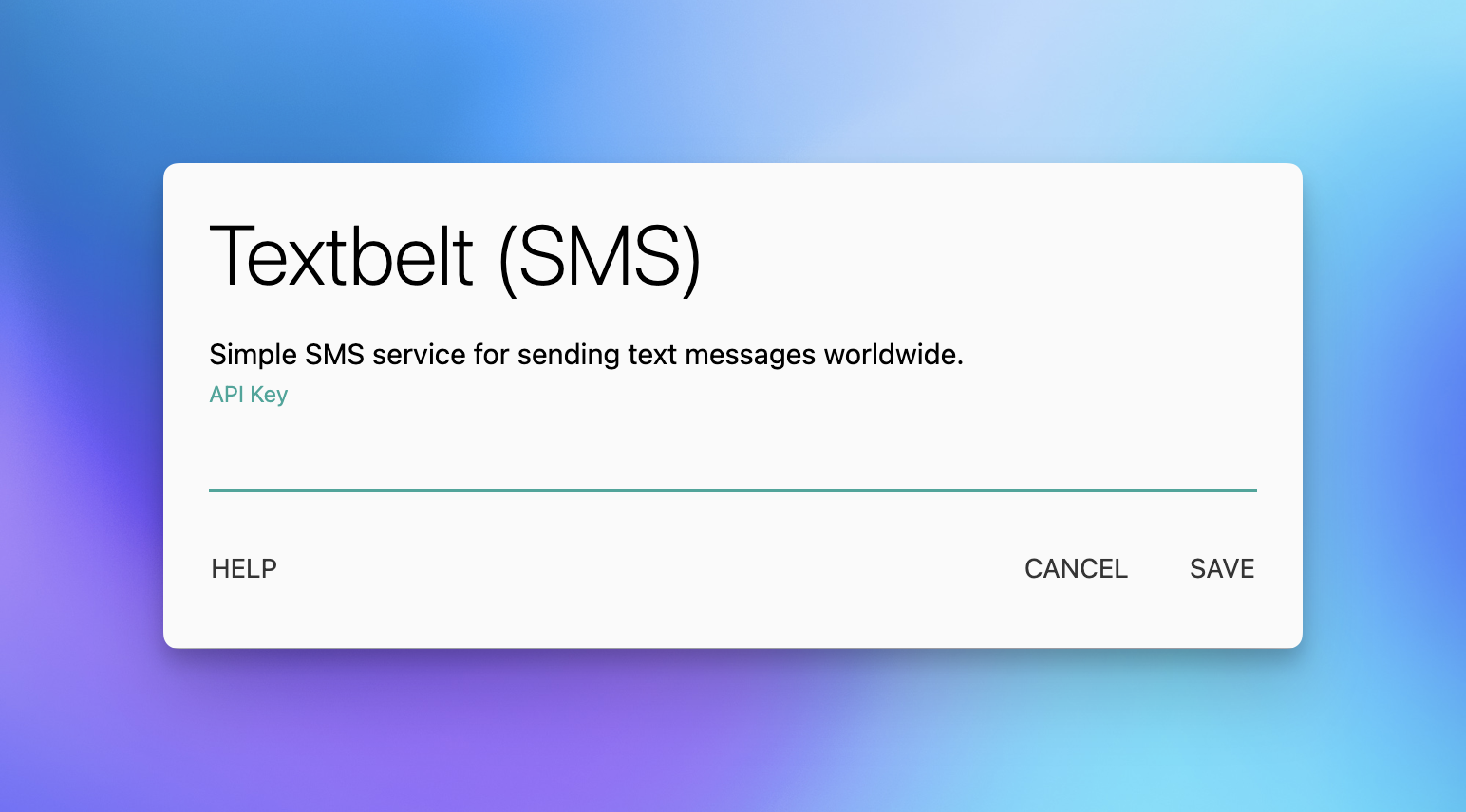Textbelt is a simple SMS notification service that you can use to send text messages from your SharpTools rules. Unlike other SMS services, Textbelt requires just a single API key, making it quick and easy to set up.