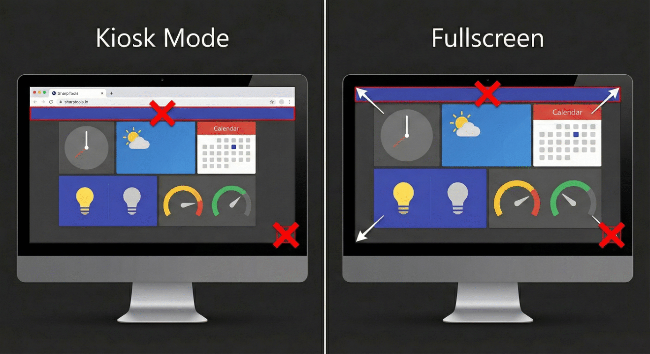One of the key differences is that when you tap the Fullscreen button, it tells the browser and SharpTools to hide the navigational elements, but if you exit out of fullscreen in your browser or the browser page reloads, then SharpTools will also exit out of kiosk mode.